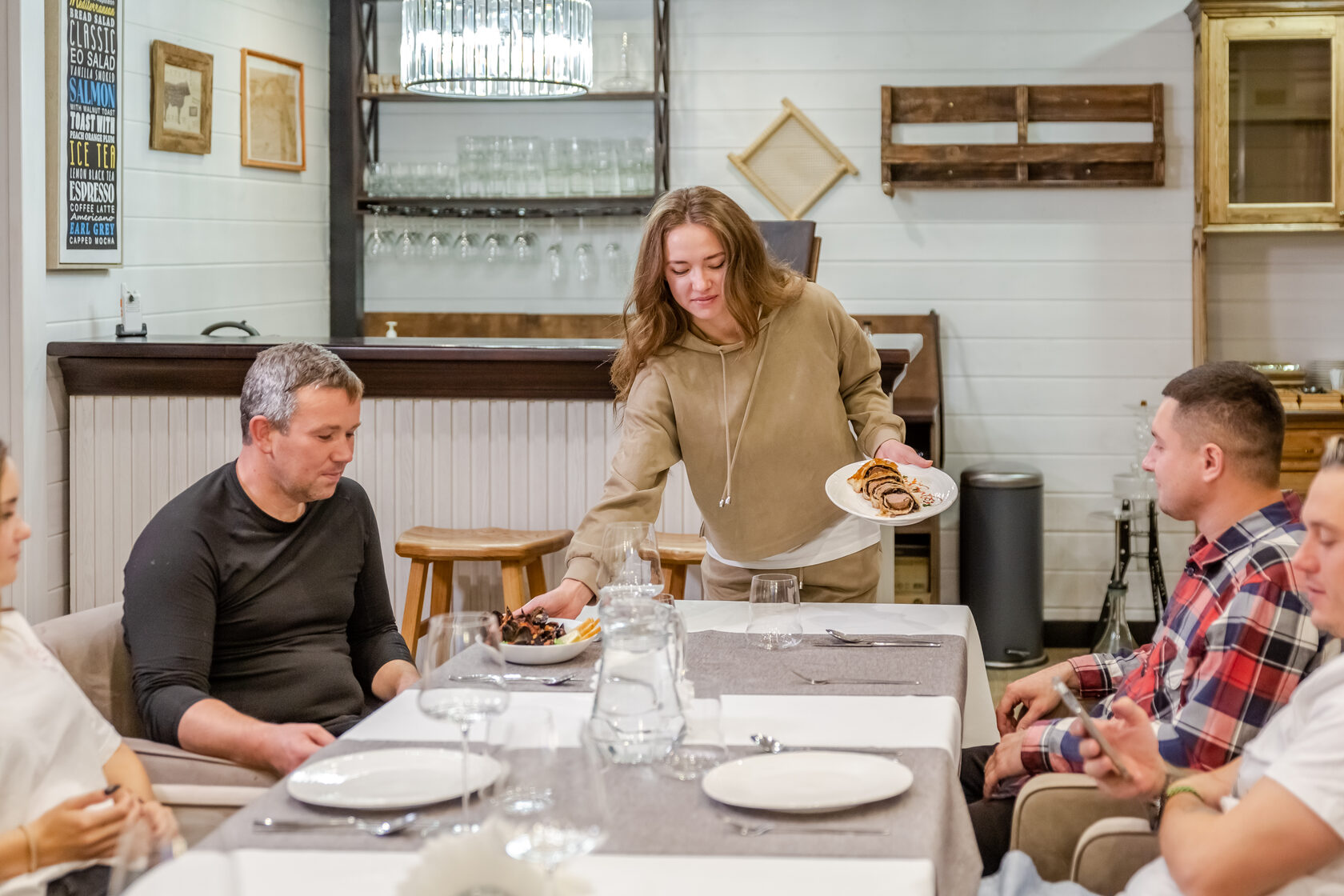 Ресторан расположен на 1 этаже гостиницы, рассчитан на 25 гостей. В помещении панорамные окна в пол, два выхода на террасу.